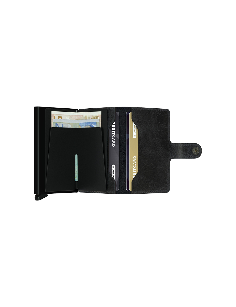 Miniwallet mit einem Cardprotector aus massivem Aluminium für bis zu sechs Karten mit Innenausstattung für z.B. Geldscheine. Der Cardprotector schützt unter anderem auch gegen unerwünschtes Auslesen von RFID-Karten. In schönem Vintage Design.